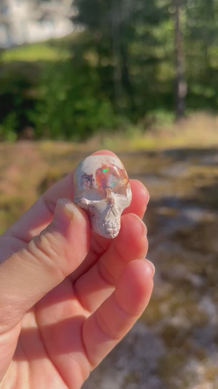 Tämä tuliopaalikallo tulee Meksikosta, Jaliscon osavaltiosta. Kallo on käsin kaiverrettu siten, että opaalin värit hohtavat kolmannen silmän kohdalla voimakkaimmin. Tuliopaalia on käytetty kivenä, jonka sanotaan tukevan rauhoittumista, selkeyttä ja sisäistä viestintää. Sen sanotaan myös kantavan sisällään luovuuden hehkua ja sisäistä kipinää – rohkaisee ilmaisemaan itseään ja sytyttää intohimon liekin. Kutsutaan myös kivien kuninkaaksi ja epäitsekkään onnen kiveksi.